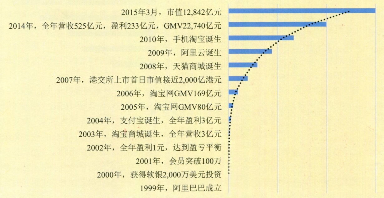 研究阿里巴巴發(fā)展歷程可以發(fā)現:1999年,阿里巴巴成立;經(jīng)過(guò)兩年發(fā)展,2001年12月其會(huì )員突破100萬(wàn),2002年全年盈利1元,達到盈虧平衡;2003年,淘寶商城誕生,承諾3年免費,全年營(yíng)業(yè)收入達到3億元。2004年,支付寶誕生,全年盈利達到3億元;2005年,淘寶網(wǎng)GMV(Gross Merchandise Value)達到80億元;2006年,淘寶網(wǎng)GMV達到169億元;2007年在港交所上市首日市值接近2,000億港元。2008年,天貓商城誕生,用以滿(mǎn)足對產(chǎn)品質(zhì)量和購物體驗有較高要求的消費者的需求;2009年,阿里云誕生,用以處理阿里巴巴平臺日益增長(cháng)的數據管理事務(wù);2010年,手機淘寶誕生;2011年以后,阿里巴巴收入及利潤逐年大幅提升,到2014年營(yíng)業(yè)收入達到525億元,全年盈利233億元,GMV達到22,740億元。