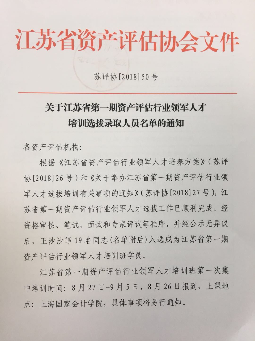 日前,江蘇省資產(chǎn)評估協(xié)會(huì )組織的江蘇省第一期資產(chǎn)評估行業(yè)領(lǐng)軍人才選拔工作順利完成。經(jīng)資格審核、筆試、面試和專(zhuān)家評議等程序,共錄取江蘇省第一批資產(chǎn)評估行業(yè)領(lǐng)軍人才培養對象19名。